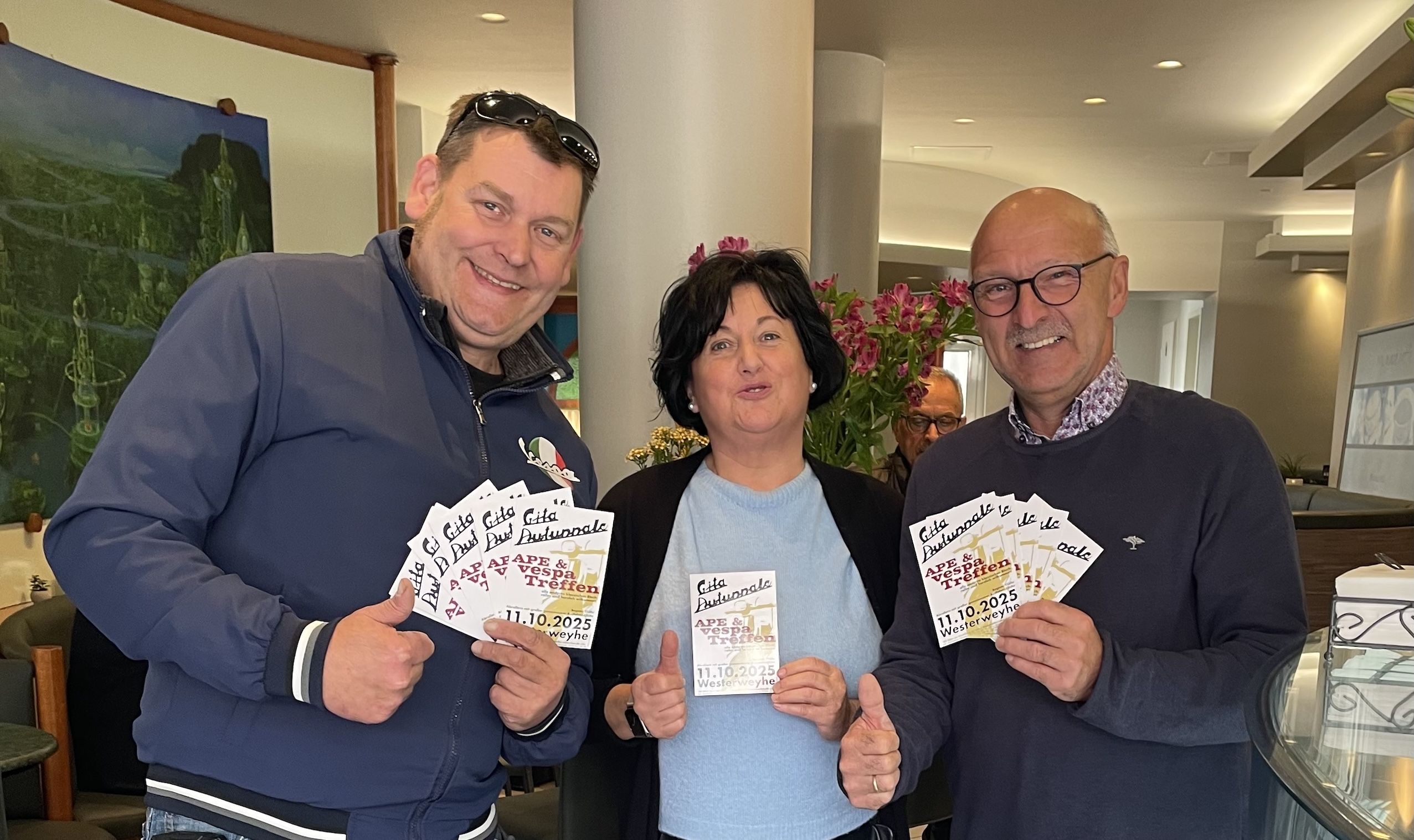 Die Organisatoren Knut Roenelt und Kalle Günther bekommen dieses Mal prominente Unterstützung: Donatella vom Eiscafé Dolomiti aus Uelzen begleitet die Veranstaltung und freut sich mit den Fans auf viele italienische Fahrzeuge und natürlich viele echte Oldtimermaschinen.