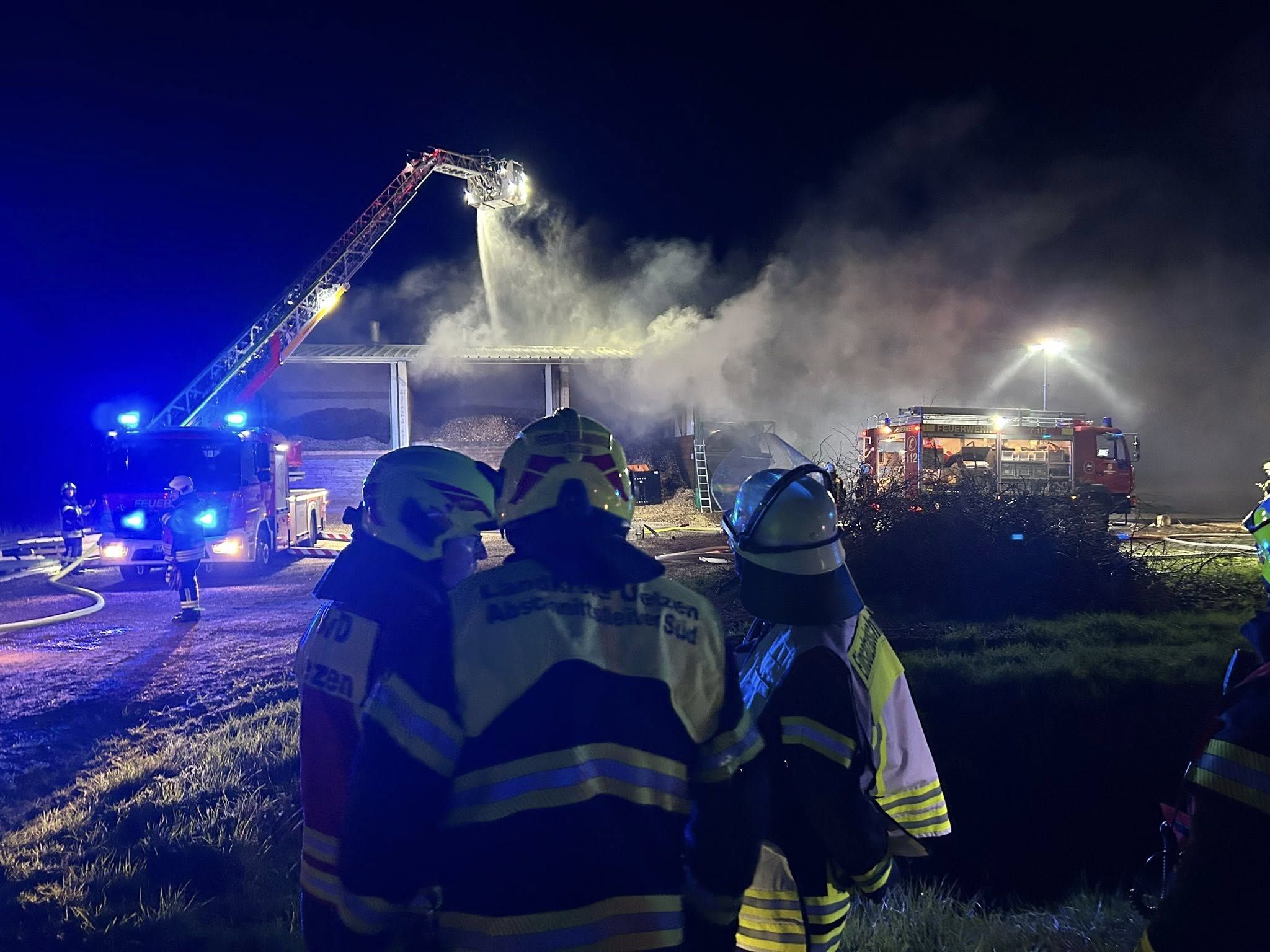 Betroffen war dieses Mal ein Holzschnitzellager in der Straße „Hinterm“ Dorf“, das zu einem benachbarten Heizkraftwerk gehört. Um 21.42 wurde Alarm ausgelöst. Im Einsatz waren die Ortswehren Oetzen, Wipperau, Riestedt, Rätzlingen, Rosche-Prielip sowie die Stadtfeuerwehr Uelzen, die mit der Drehleiter anrückte. Außerdem vor Ort: ,DRK…