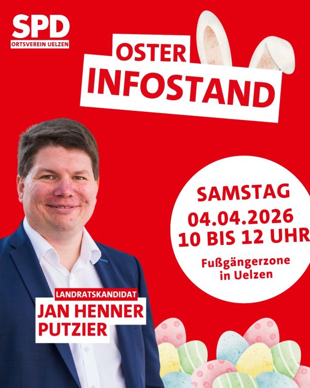 Uelzen. Der SPD-Ortsverein Uelzen lädt am Samstag, den 4. April 2026, zu einem Oster-Infostand in der Uelzener Innenstadt ein. In der Fußgängerzone haben Bürgerinnen und Bürger von 10 bis 12 Uhr die Gelegenheit, mit Vertreterinnen und Vertretern der SPD ins Gespräch zu kommen.
