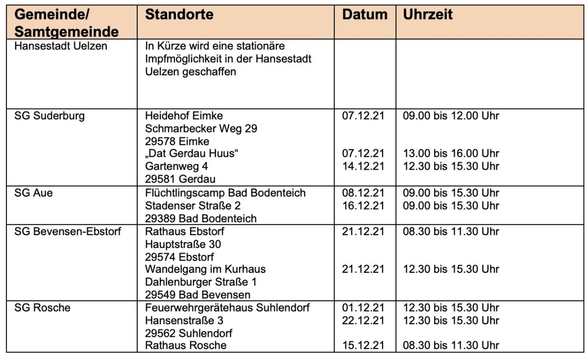 Uelzen/Landkreis. Der Landkreis Uelzen setzt (wie bereits mit Pressemitteilung vom 19. November 2021 angekündigt) seine Angebote zur dezentralen Impfung fort. Die mobilen Impfteams werden weiterhin in allen Samt- und Einheitsgemeinden des Landkreises zu bestimmten Terminen an verschiedenen Standorten Erst- und Zweitimpfungen sowie auch die sogenannten Booster- bzw. Auffrischungsimpfungen anbieten. Verwendet werden der Impfstoff von BioNTech sowie Moderna. Ein Wunsch- beziehungsweise Wahlrecht besteht nur im Rahmen der Verfügbarkeit.