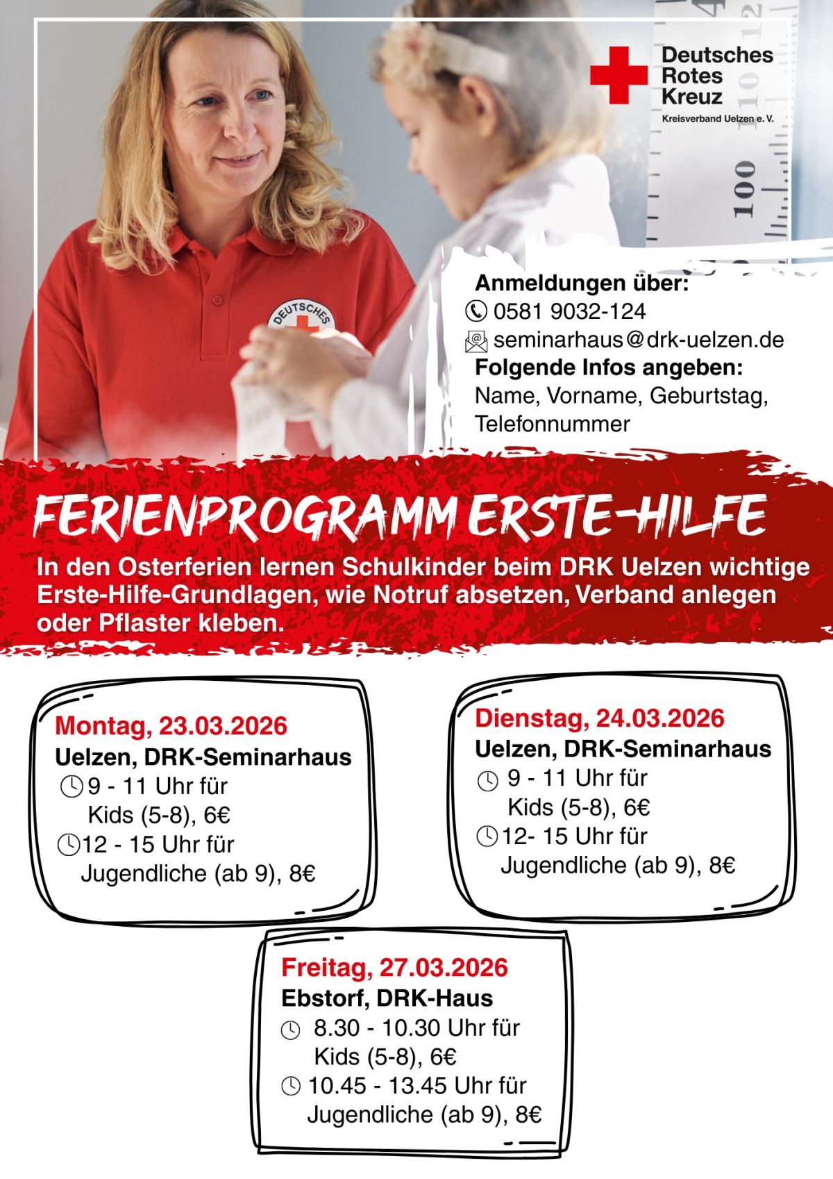 Uelzen. Sicherheit und Erste Hilfe für Kinder: Der DRK-Kreisverband bietet Kurse in Uelzen und Ebstorf an: Wie verhalte ich mich richtig, wenn jemand Hilfe braucht? Wie erkenne ich Gefahren? Und was kann ich selbst tun, um sicher durch den Alltag zu kommen? Mit diesen wichtigen Fragen beschäftigt sich der Kurs „Sicherheit und Erste Hilfe für Kinder“ des DRK im Rahmen des Ferienprogramms.