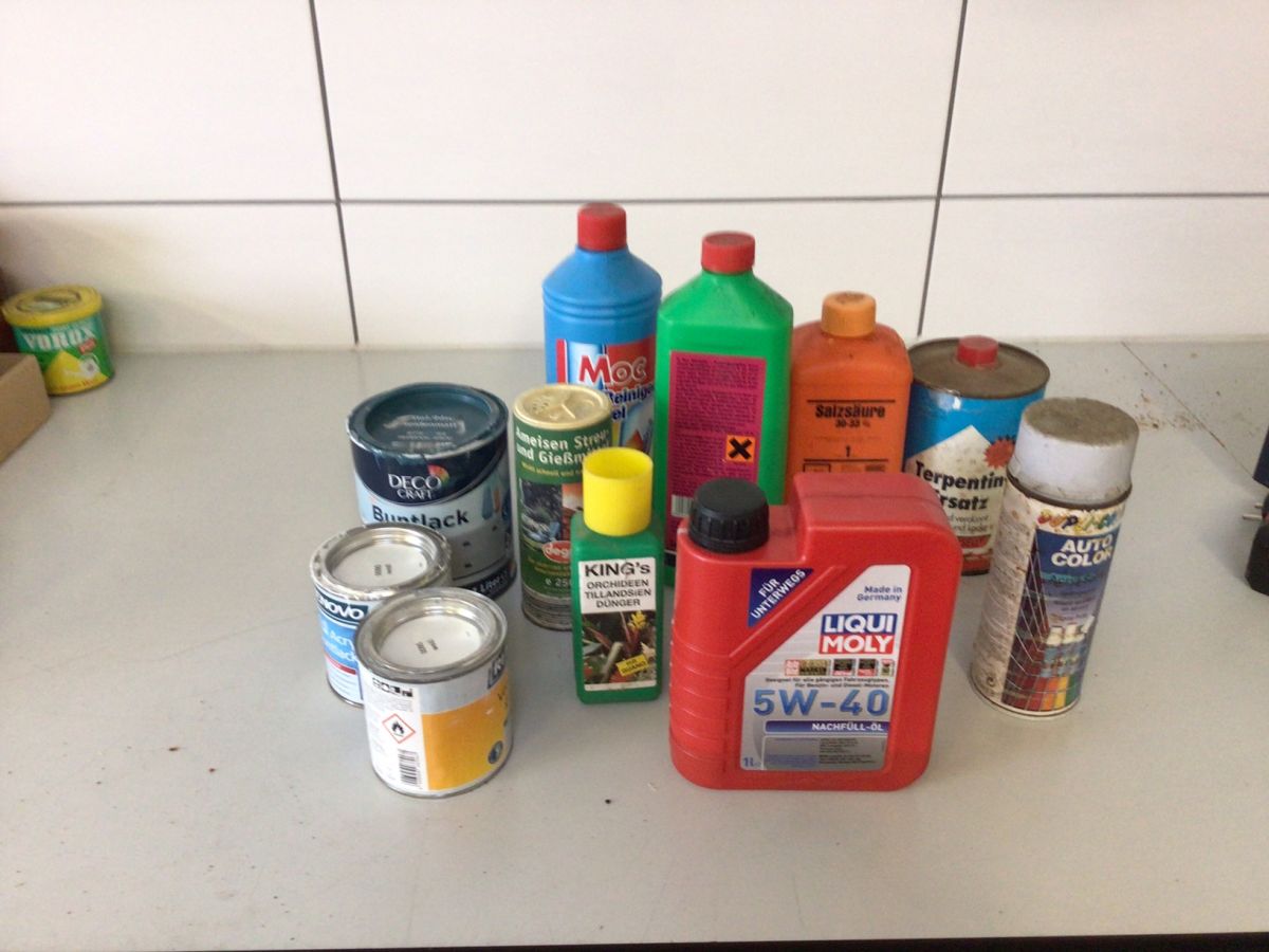 Restentleerte Behältnisse wie Farb- und Spraydosen sowie Reinigungsmittelkanister und Ähnliches ohne Gefahrstoffzeichen.