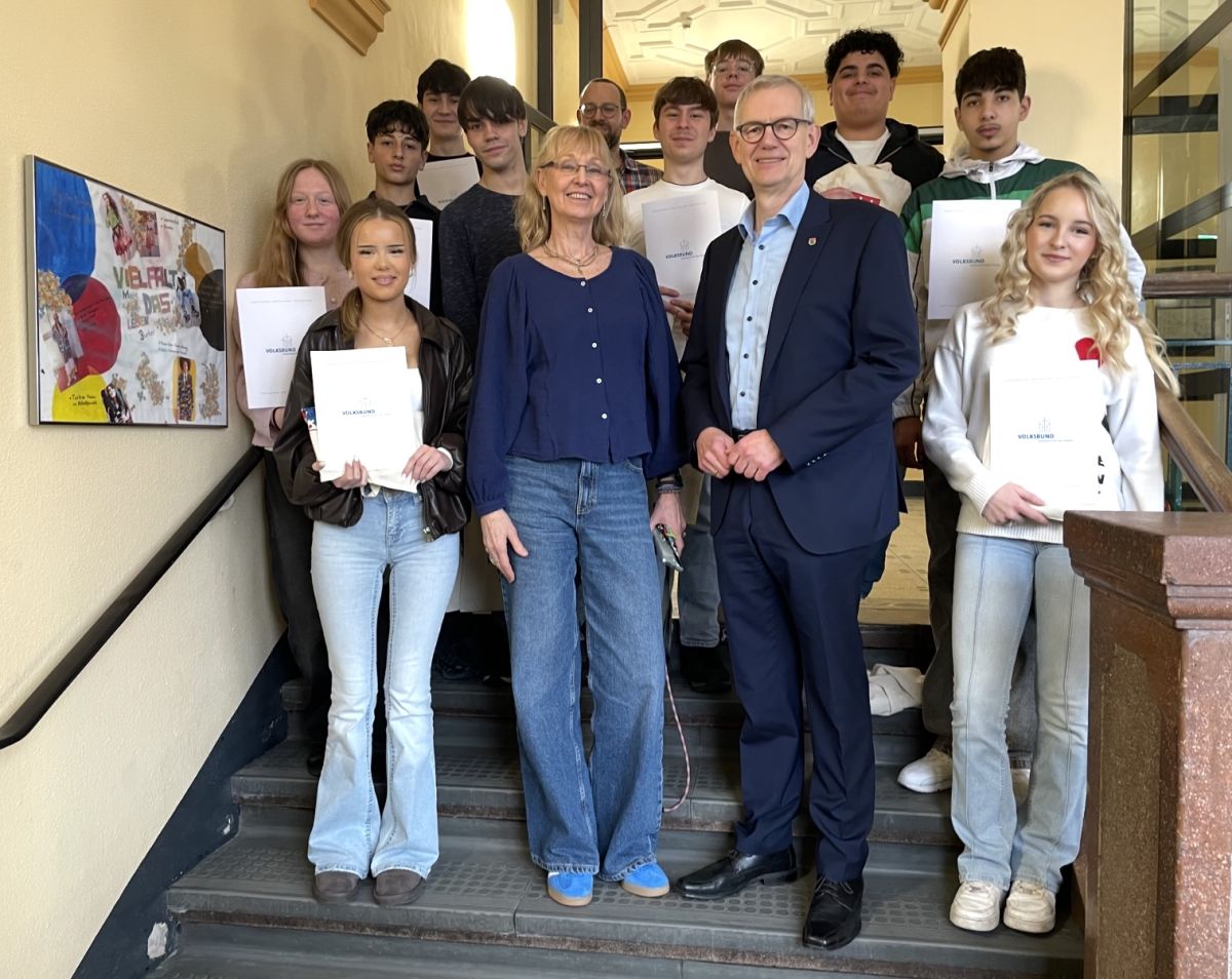 Uelzen/Landkreis. Schülerinnen und Schüler der Apollonia Oberschule Uelzen haben sich im vergangenen Jahr an der Haus- und Straßensammlung des Volksbundes Deutsche Kriegsgräberfürsorge e.V. beteiligt. Der Vorsitzende des Kreisverbandes Uelzen Landrat Dr. Heiko Blume hat sich für diese aktive Friedensarbeit bei den teilnehmenden Schülerinnen und Schülern persönlich bedankt und jeder und jedem Teilnehmenden eine entsprechende Urkunde überreicht. Darüber hinaus sprach Dr. Blume dem Kontaktlehrer Tim Bettray, auf dessen Initiative die Sammlung der Oberschülerinnen und Oberschüler zurückgeht, seinen Dank aus.