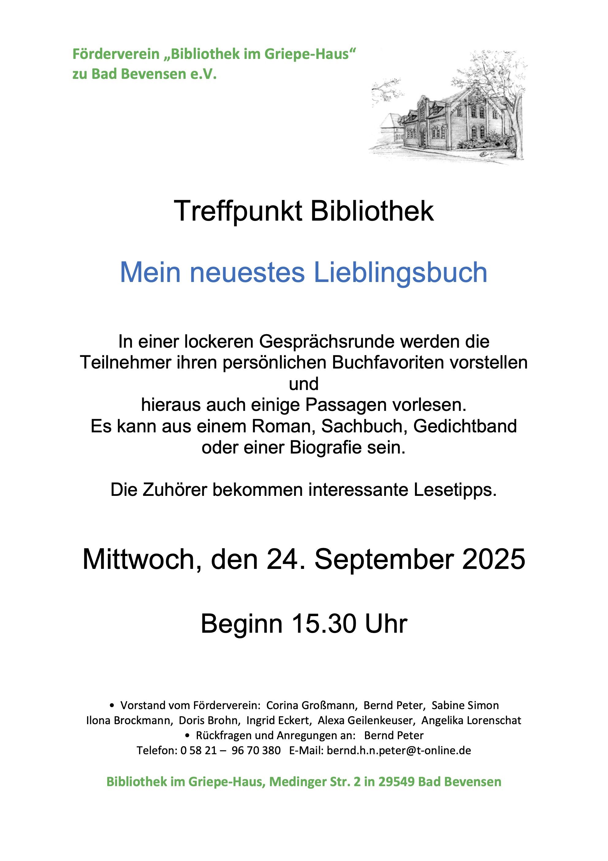 Natürlich sind auch Zuhörer willkommen, die sich hier Vorschläge für besonders lesenswerte Bücher geben lassen möchten. Der Termin ist am Mittwochnachmittag, den 24. September 2025 um 15.30 Uhr in der Bibliothek im Griepe-Haus in Bad Bevensen, Medinger Str. 2.