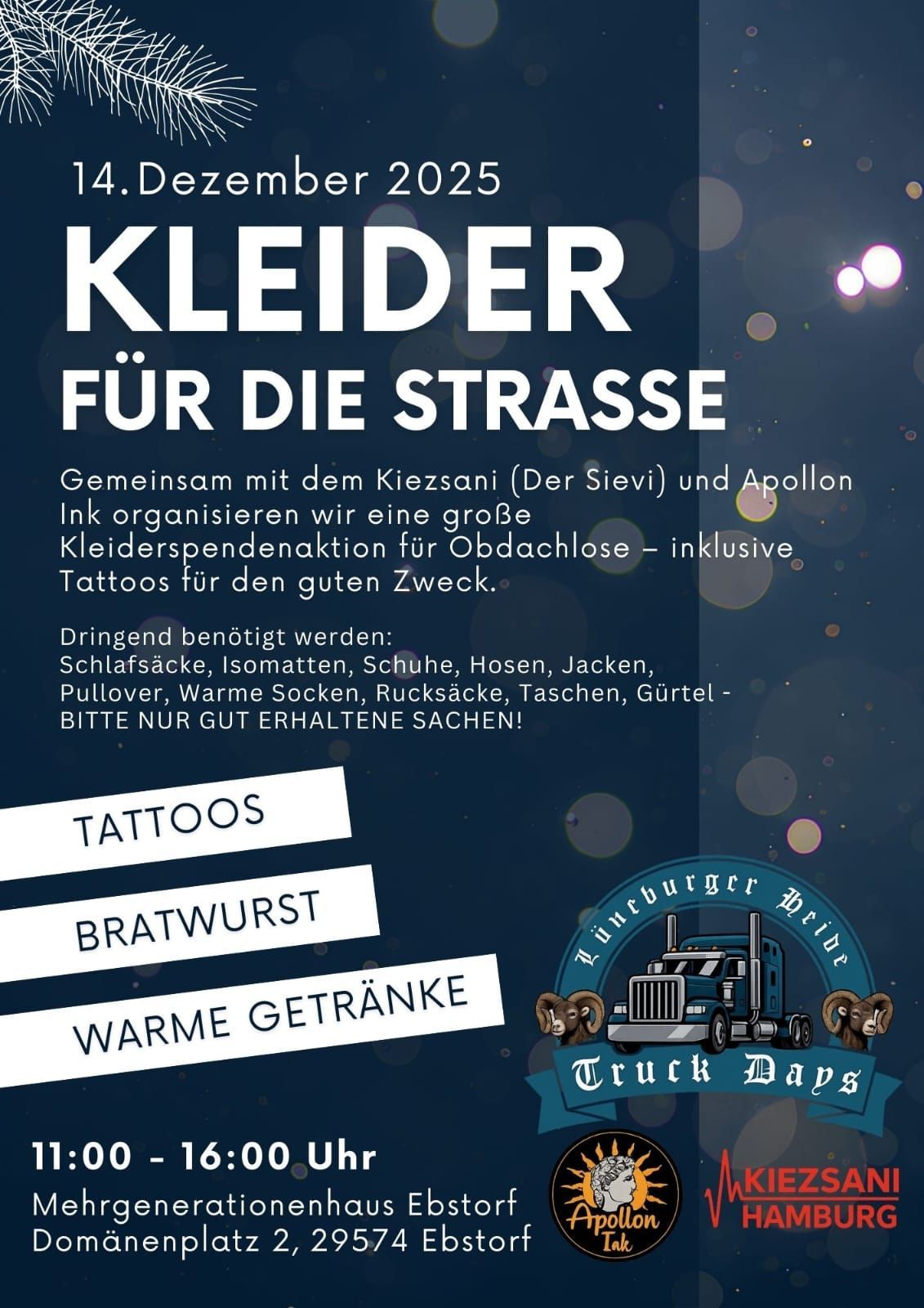 Deswegen sind die Macher der Truck Days Lüneburger Heide, die ansonsten vor allem durch ihre sommerliche Show chromglänzender, schwerer Zugmaschinen auf dem Ebstorfer Schützenplatz für viel Aufmerksamkeit in der Region sorgen, auf eine ganz besondere Idee gekommen: „Kleider für die Straße“ heißt die Aktion, die am 14. Dezember im Mehrgenerationenhaus Ebstorf steigt.