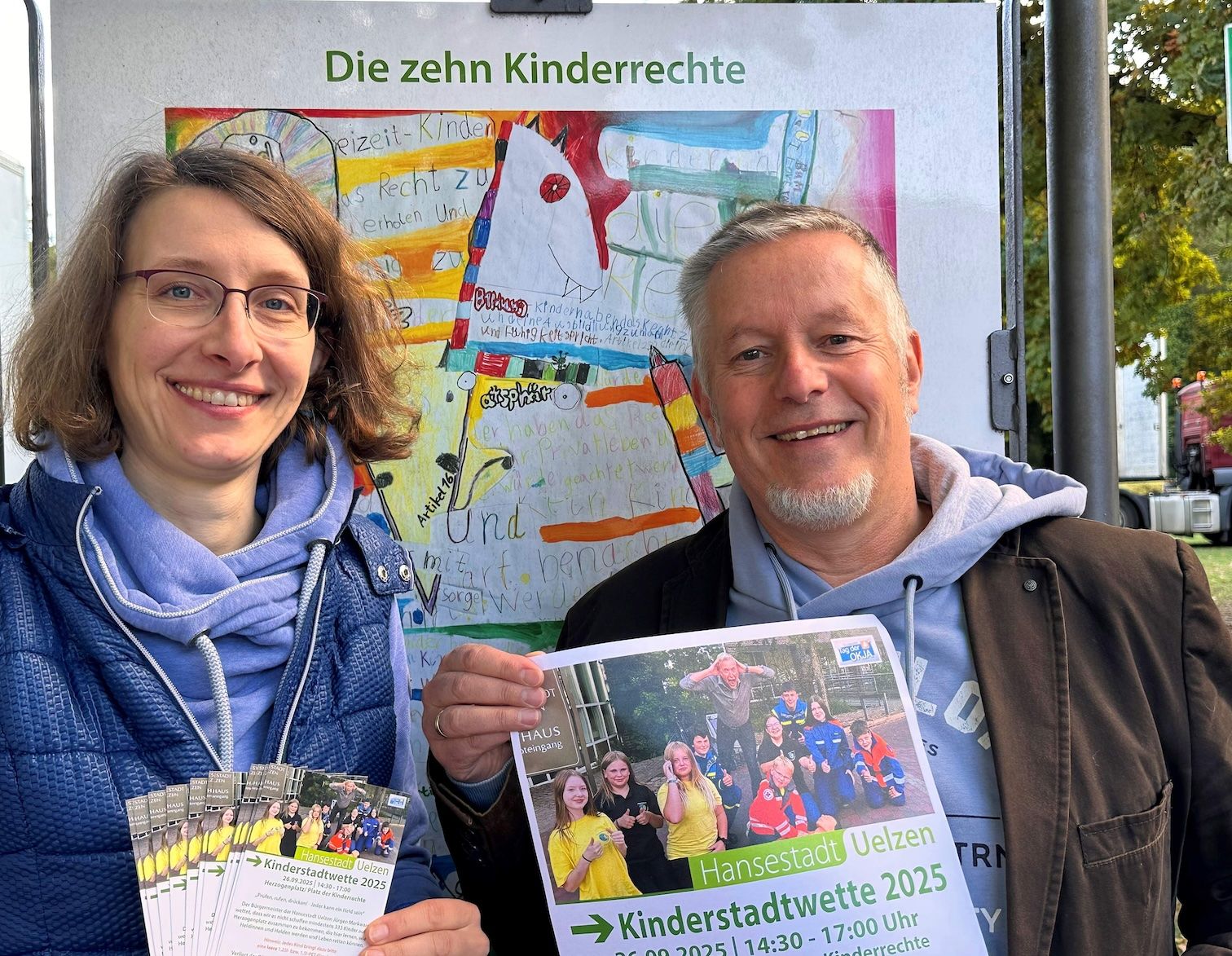 Foto (Hansestadt Uelzen): Luise Hinrichs, Leiterin des Kinder- und Jugendzentrums Baxx, und Stadtjugendpfleger Christian Helms rufen zur Kinderstadtwette auf.