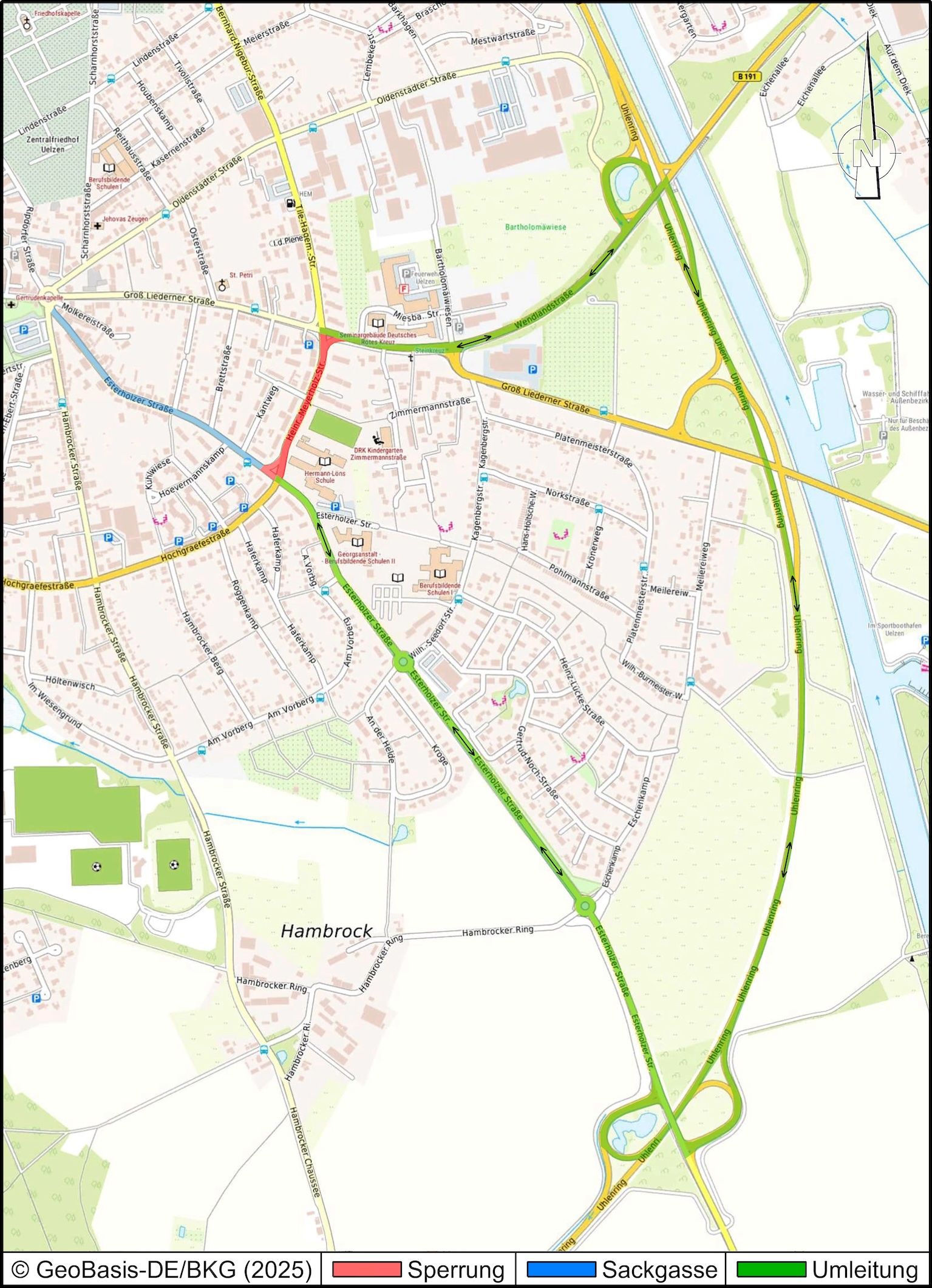 Der Verkehr der Heinrich-Meyerholz-Straße wird über die Esterholzer Straße, Landesstraße 270 und die Ortsumgehung Bundesstraße 4 (B4) umgeleitet. Von der Groß Liedener Straße aus startet die Umleitung in die andere Richtung über die B4. Umleitungen werden entsprechend ausgeschildert. Die Zufahrt zur Grundschule und der BBS II Georgsanstalt über die Esterholzer Straße ist zu jeder Zeit möglich.