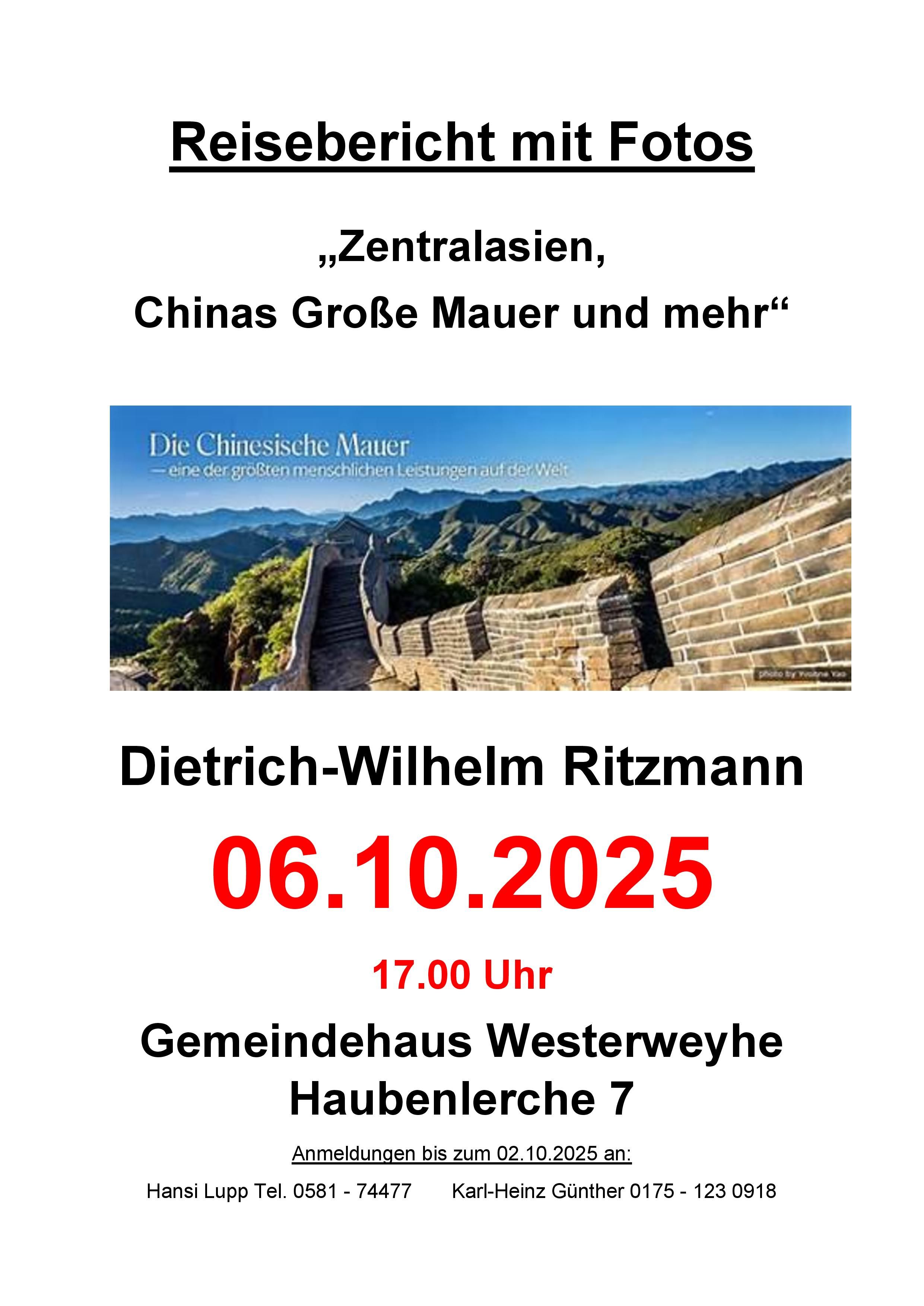 Westerweyhe. Es geht weiter mit den Westerweyher Lesungen im Gemeindehaus. Dazu hat der Männerkreis Dietrich-Wilhelm Ritzmann eingeladen. Er hat einen Reisebericht mit vielen sehenswerten Fotos vorbereitet und berichtet über Erlebnisse aus Zentralasien, der Chinesischen Mauer und mehr.