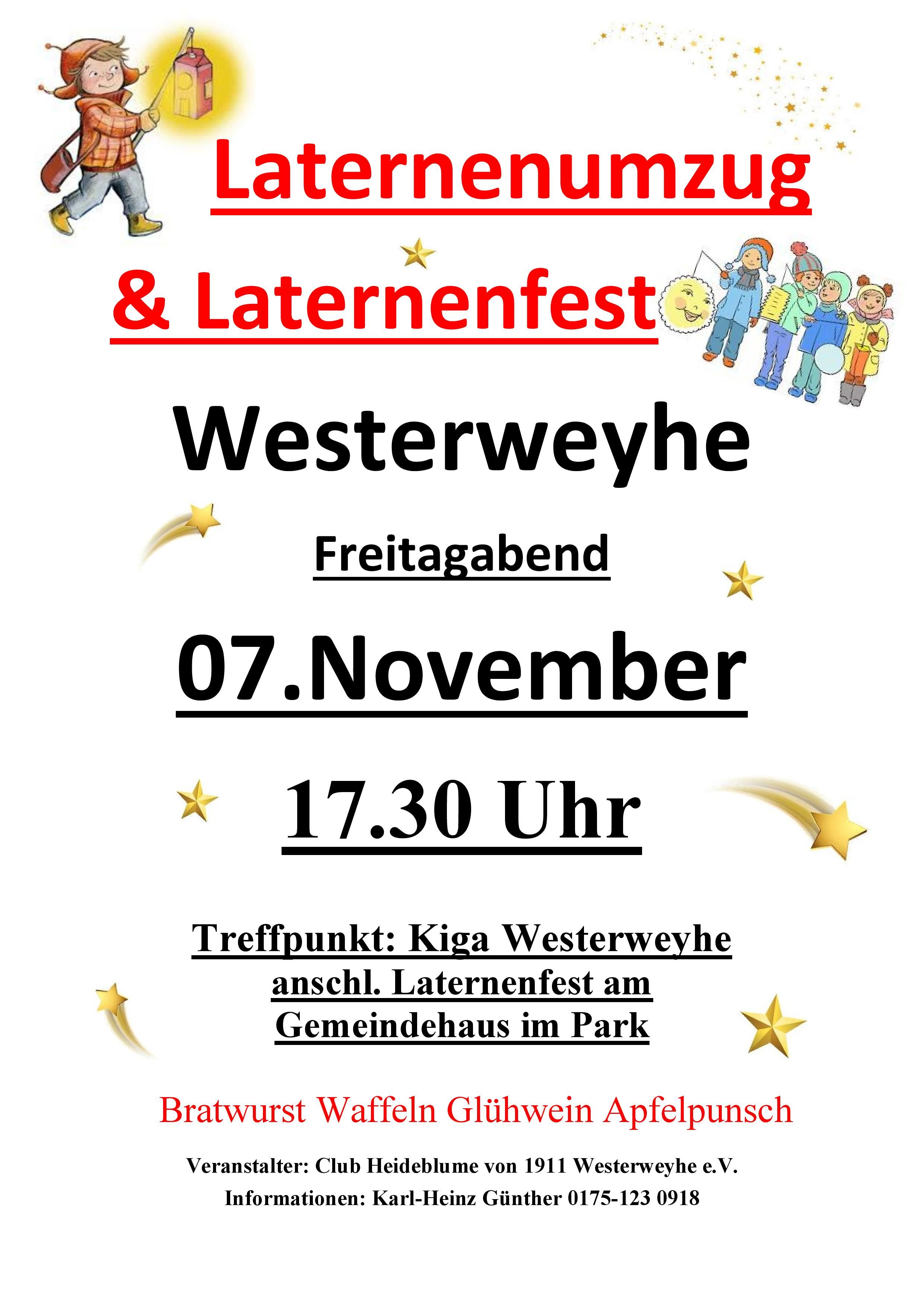 Westerweyhe. Das Jahr neigt sich dem Ende zu, und die letzten Open-Air-Veranstaltungen finden statt. Der Club Heideblume Westerweyhe lädt am Freitagabend, 7.11.2025, zum großen Laternenumzug durch den Ort ein.