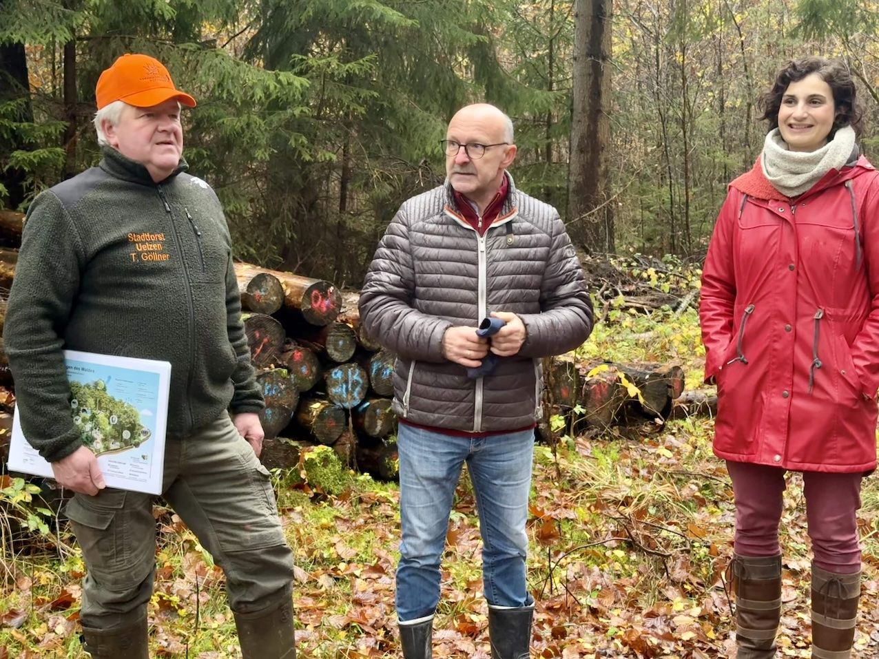 Zum Auftakt erklärte Stadtförster Thomas Göllner, warum der Waldumbau notwendig sei: „Die vergangenen Jahre zeigen deutlich, wie stark Trockenperioden und Extremwetter unseren Waldbestand belasten. Wir müssen heute handeln, damit der Wald den künftigen klimatischen Bedingungen standhalten kann“, betonte er, bevor die Gruppe zur Pflanzfläche aufbrach, die der Borkenkäfer zuvor schwer geschädigt hatte.