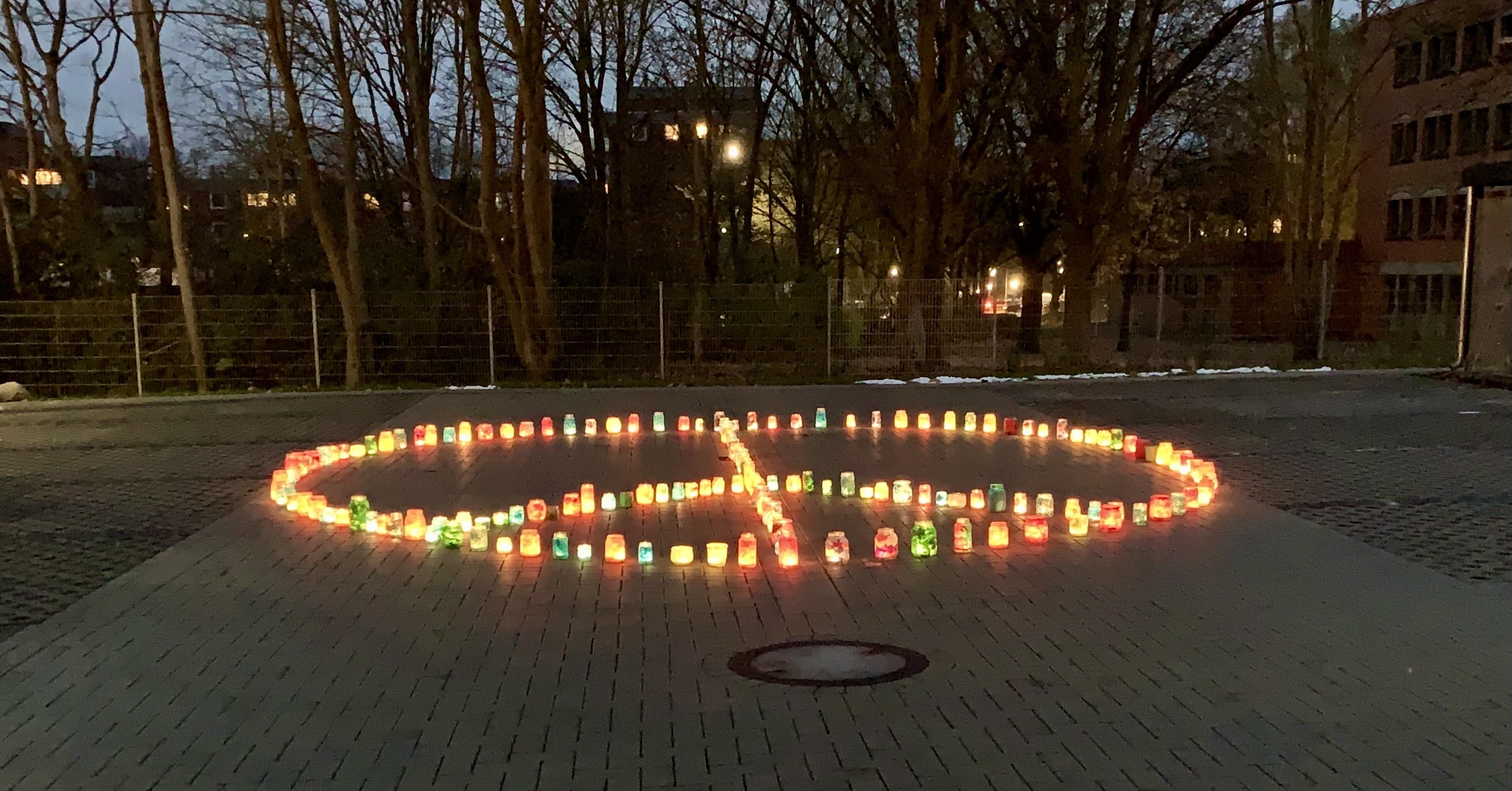 Zuvor hatte es ausgiebig Gelegenheit gegeben, sich an dem riesigen Buffet im Freien zu stärken, für das die Eltern gekocht und gebacken hatten. „Wo begegnen sich Menschen? Beim Essen“, hielt Kita-Leiterin Alexandra Karp fest. Denn dem Miteinander kommt im Leitbild der Tagesstätte höchste Bedeutung zu: „Wir haben Kinder aus 25 Nationen bei uns“, so Karp. Auch in diesem Jahr wieder ein absoluter Hingucker: Das Friedenszeichen aus Kerzen. Ein rührendes Fotomotiv, das Familien der Kinder teils an ihre Verwandten in Länder schicken, in denen Frieden gefährdet ist oder Konflikte toben.