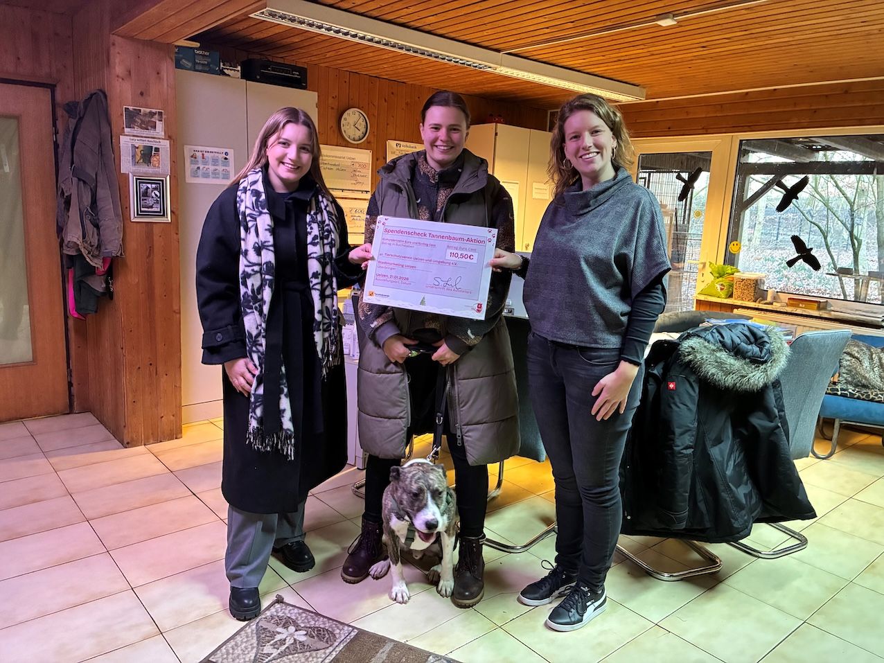 Uelzen. Nach dem großen Finale des Uelzener Adventskalenders am 23.12.2025 lud das Stadtmarketing Uelzen erneut zur Tannenbaum-Aktion ein. Dabei wurden die für den Adventskalender aufgestellten Tannenbäume gegen eine freiwillige Spende an Bürgerinnen und Bürger abgegeben. Der dabei gesammelte Betrag in Höhe von 110,50 Euro wurde dem Tierheim Uelzen übergeben und kommt dort direkt den Tieren zugute.