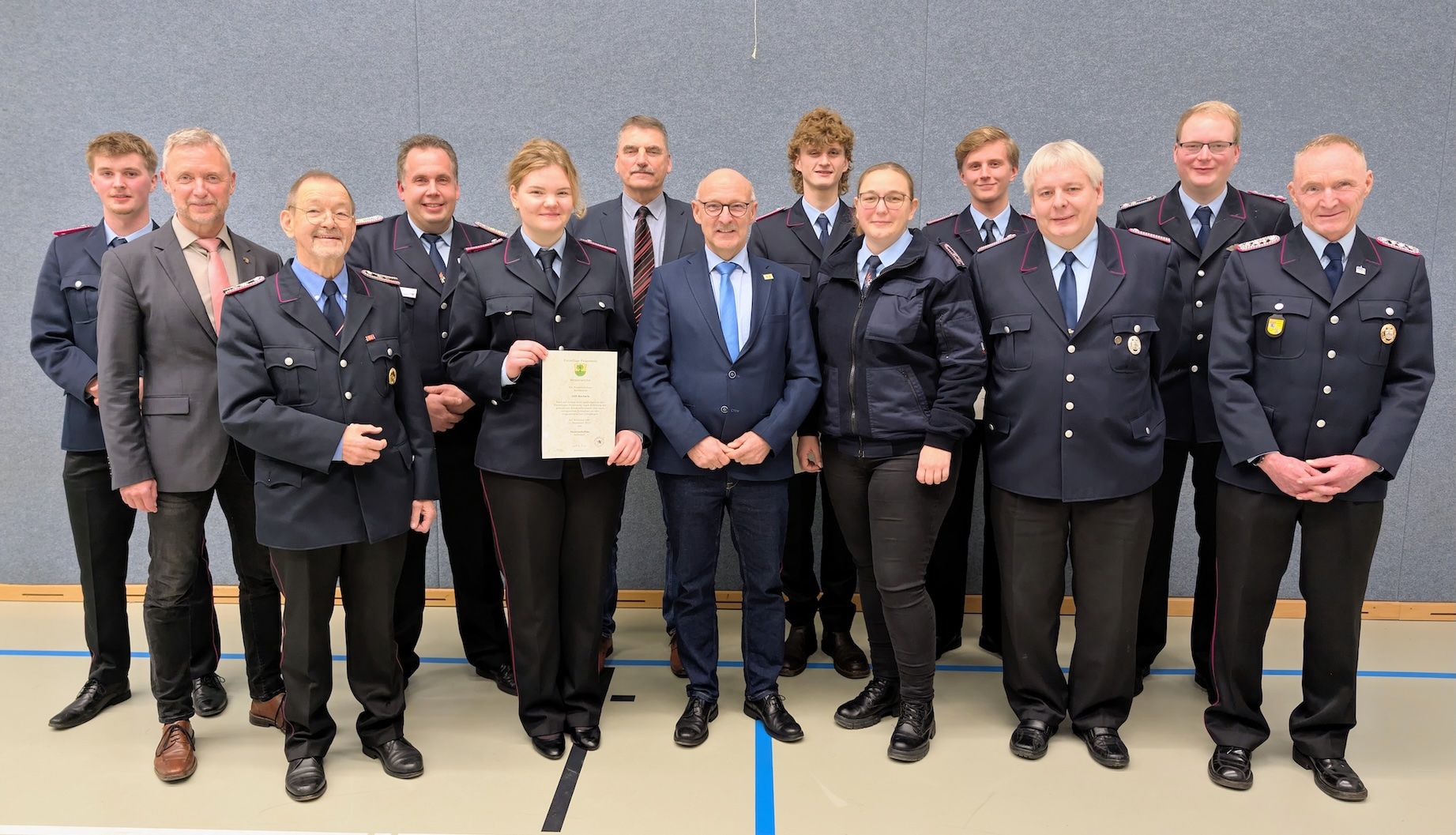 Mehrere Anwärterinnen und Anwärter konnten befördert werden: Lilly Bacherle wurde zur Feuerwehrfrau ernannt. Die Anwärter Terrence Brömme, Simon Meyer und Lauri Sommerfeld wurden zu Feuerwehrmännern befördert. Für ihren Einsatz während der Hochwasserlage 2023/2024 erhielten Hauptfeuerwehrmann Jan Christoph Schlüter sowie Feuerwehrmann Lovis Sommerfeld die Hochwassermedaille.