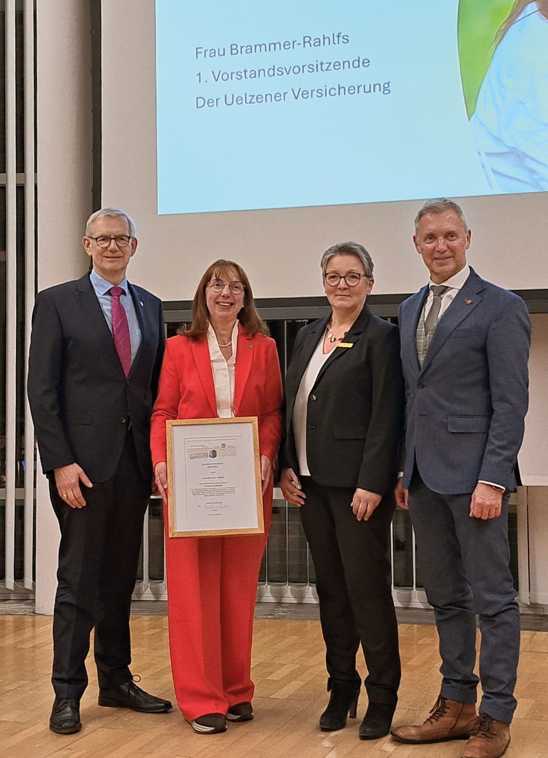 Der Preis und die Urkunde wurden im Ratssaal Uelzen feierlich überreicht. Vertreterinnen und Vertreter aus Stadt, Landkreis und dem Soroptimist-Club richteten dabei Grußworte an die Geehrte. In seiner Laudatio ließ Dr. Felix Garlipp, Bereichsleiter Produkt- und Portfoliomanagement bei den Uelzener Versicherungen, den beruflichen Werdegang seiner Vorgesetzten Revue passieren. Er hob dabei nicht nur ihre Fachkompetenz hervor, sondern auch ihre ausgeprägte fürsorgliche Haltung und ihre Vorbildrolle für Frauen in Wirtschaft und Gesellschaft, insbesondere mit Blick auf die Vereinbarkeit von Familie und Beruf. Imke Brammer-Rahlfs ist Mutter zweier erwachsener Kinder.