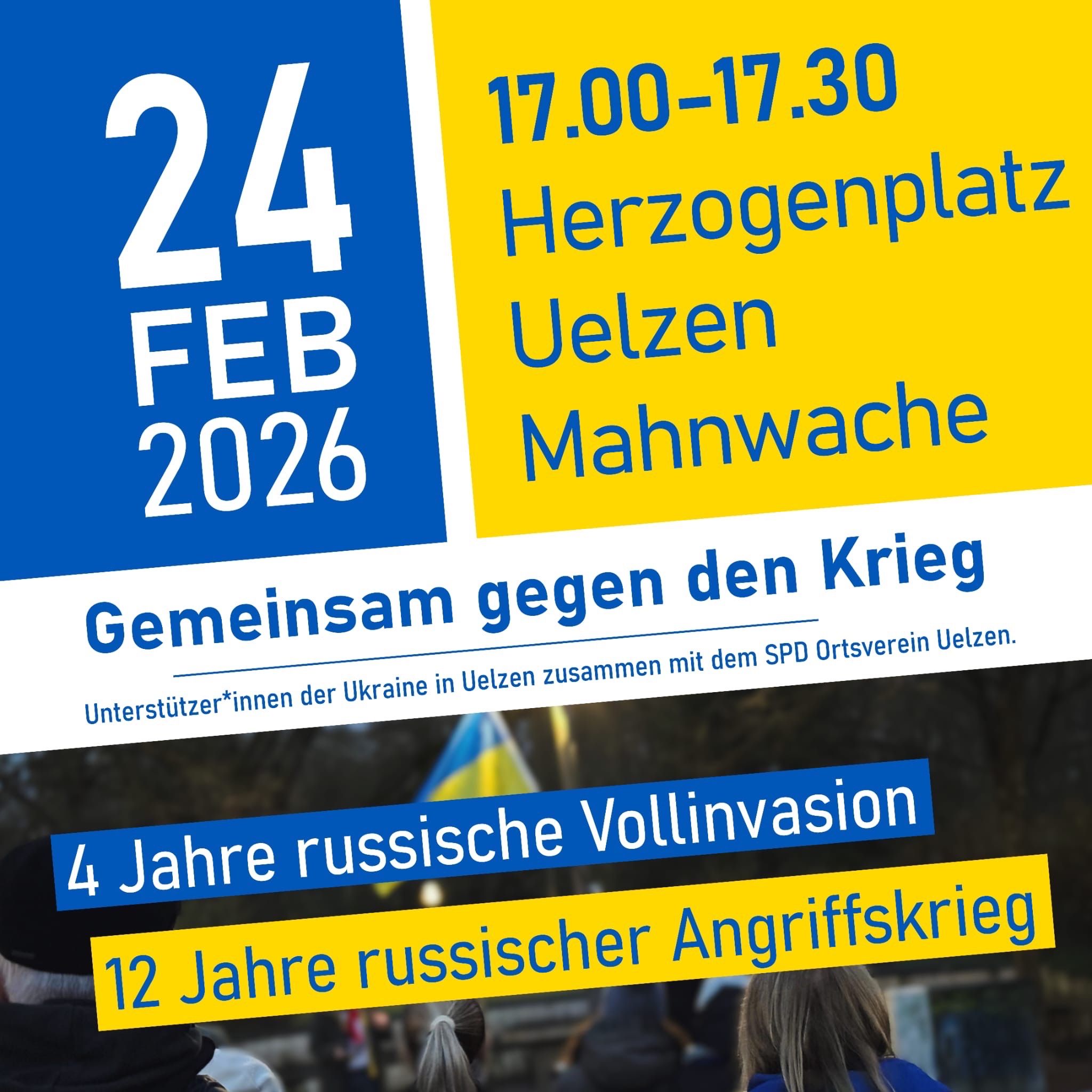 Anlässlich dieses traurigen Jahrestages veranstaltet der SPD-Ortsverein Uelzen ab 17 Uhr eine kurze Mahnwache auf dem Herzogenplatz: „Wir freuen uns, wenn viele Menschen kommen und ihre Solidarität mit den Ukrainerinnen und Ukraine zeigen, gern mit den Farben der ukrainischen Fahne.“