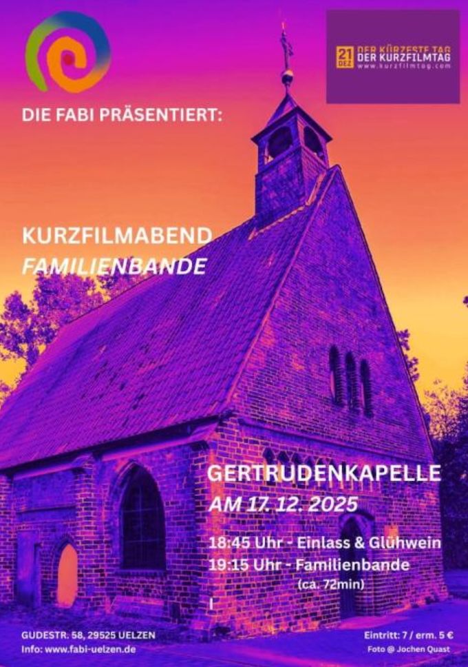 Uelzen. Der Kurzfilmtag ist Deutschlands größter Aktionstag rund um den kurzen Film. Zu diesem Anlass veranstaltet die Evangelische Familien-Bildungsstätte am 17. Dezember in der frisch renovierten Gertrudenkapelle Uelzen einen besonderen Kurzfilmabend.