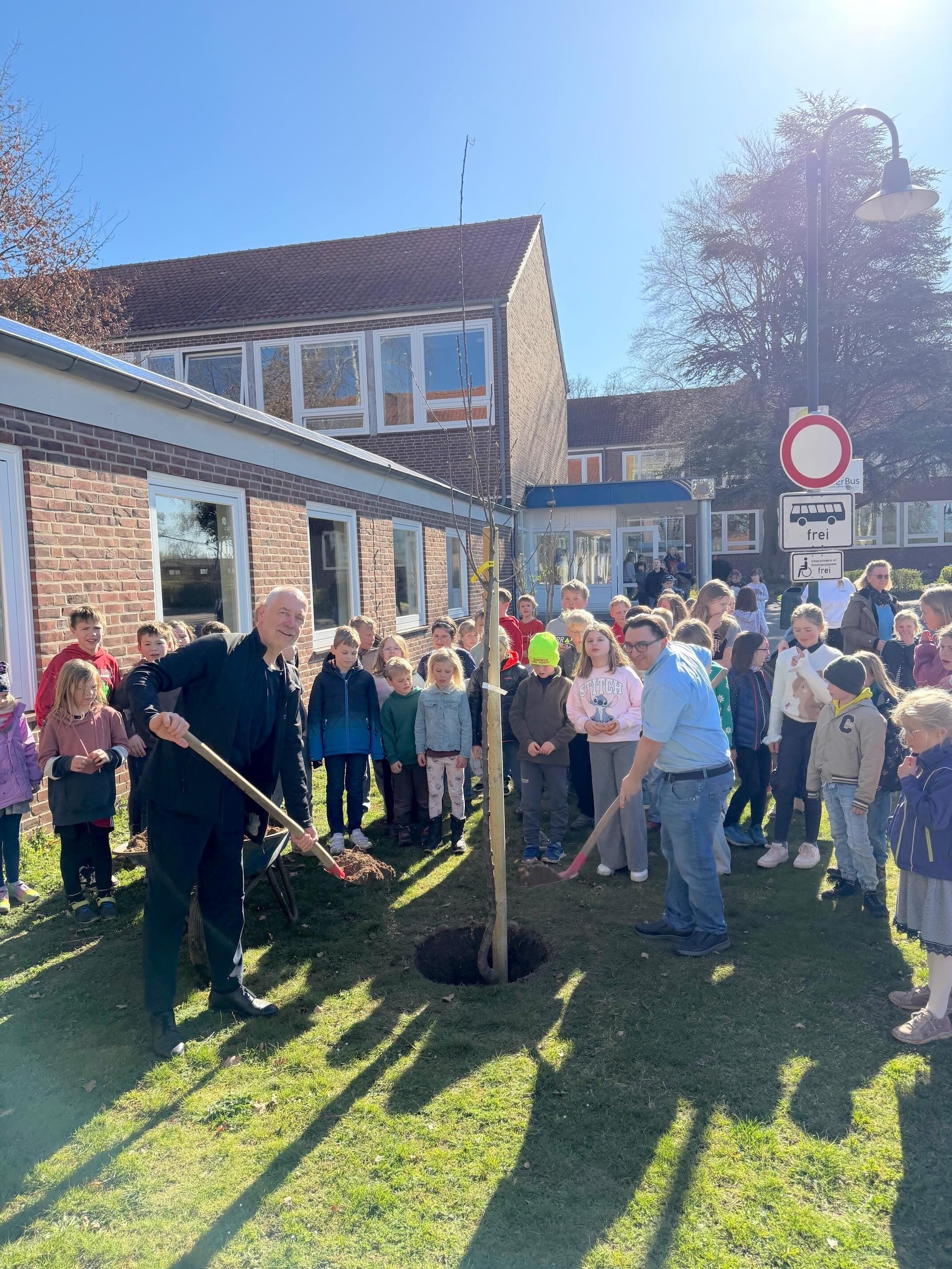 Himbergen. Interessiert kommen die Himberger Grundschülerinnen und -schüler vom Pausenhof vor das Schulgebäude. Dort warten bereits Schulleiter Reimund Rose und Samtgemeindebürgermeister Martin Feller. Schubkarre mit frischer Erde, zwei Schaufeln und Hausmeister Jan Brötzmann mit einem Mirabellenbaum in der Hand stehen bereit. Und nach einer kurzen Begrüßung geht es los: Rose und Feller pflanzen den Mirabellenbaum in die Erde und erhalten dabei Unterstützung von einigen Schülerinnen und Schülern. „Dieser Baum ist einer von 31 neuen Bäume auf dem Schulgelände“, freuen sich die beiden.