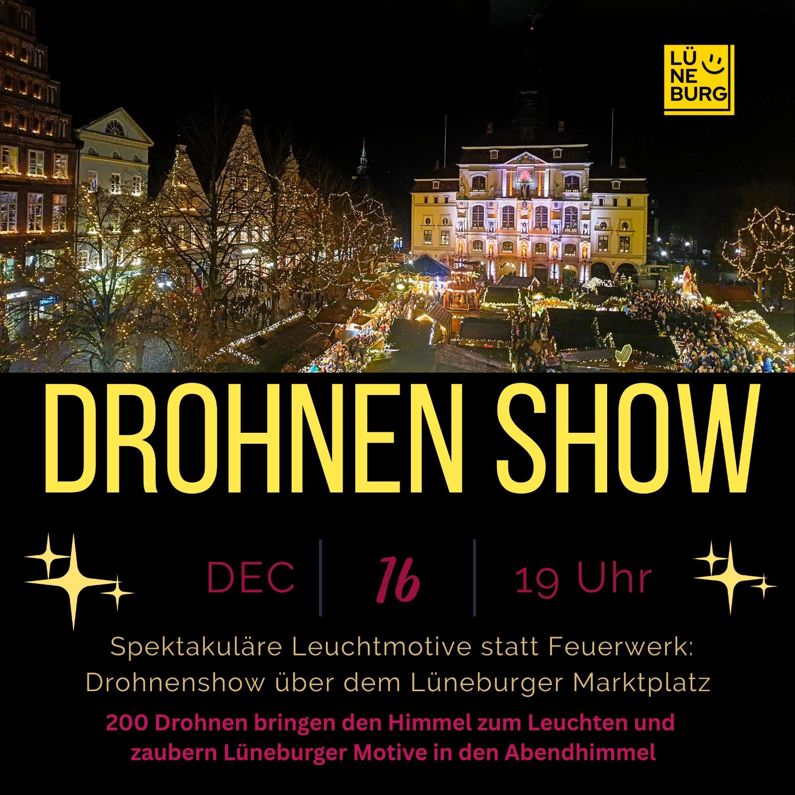 Lüneburg. Eine spektakuläre Drohnenshow mit rund 200 Drohnen bringt am 16. Dezember 2025 um 19 Uhr den Himmel über dem Liebesgrund zum Leuchten und zaubert Lüneburger Motive wie z.B. das Rathaus in den Abendhimmel.