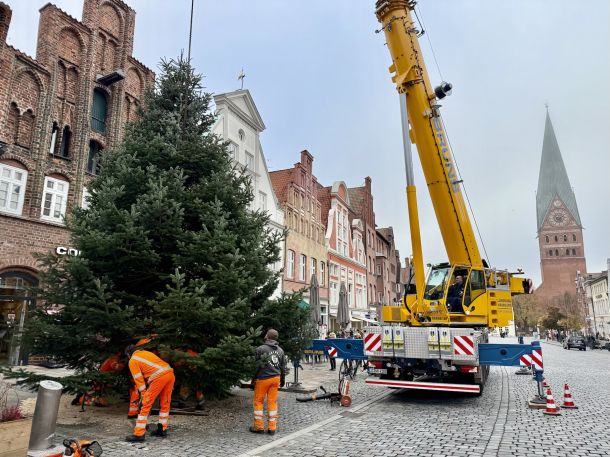 Lüneburg. Oh Tannenbaum! Der erste prachtvolle Christbaum ist heute beim Platz am Sande eingeflogen – eine rund 10 Meter hohe Nordmanntanne aus Mechtersen. Insgesamt zehn große Tannen stellen Marktmeister Norbert Stegen und ein Team der AGL in diesen Tagen an den bekannten Standorten auf, unter anderem am Kreideberg, in Kaltenmoor, am Stintmarkt und im Rathausgarten.