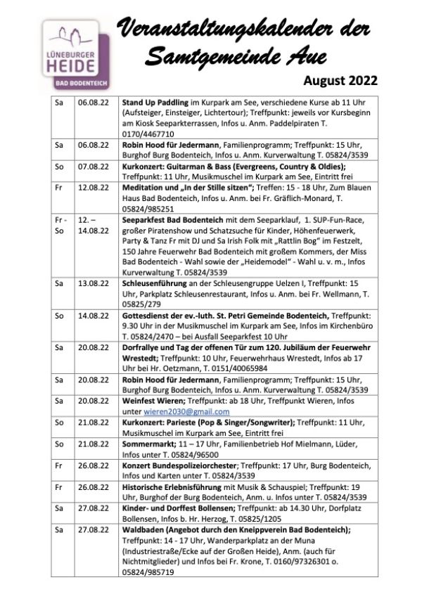 Bad Bodenteich. Die Samtgemeinde Aue teilt das aktuelle Veranstaltungsprogramm mit: