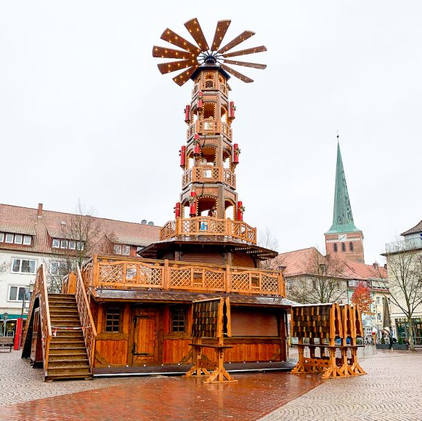 Uelzen. Da steht sie unübersehbar auf dem Herzogenplatz – die gewaltige Weihnachtspyramide, die eine komplette Gastronomie beherbergen kann. Am kommenden Freitag, 18 Uhr, beginnt er, der Uelzener Weihnachtszauber. Natürlich spielt die Frage der Sicherheit angesichts der hohen Inzidenzzahlen eine wichtige Rolle. Das Stadtmarketing versichert: Alle, die mit der Organisation betraut sind, haben die Zahlen im Auge. Entsprechend werden dann aktuelle Regelungen getroffen.