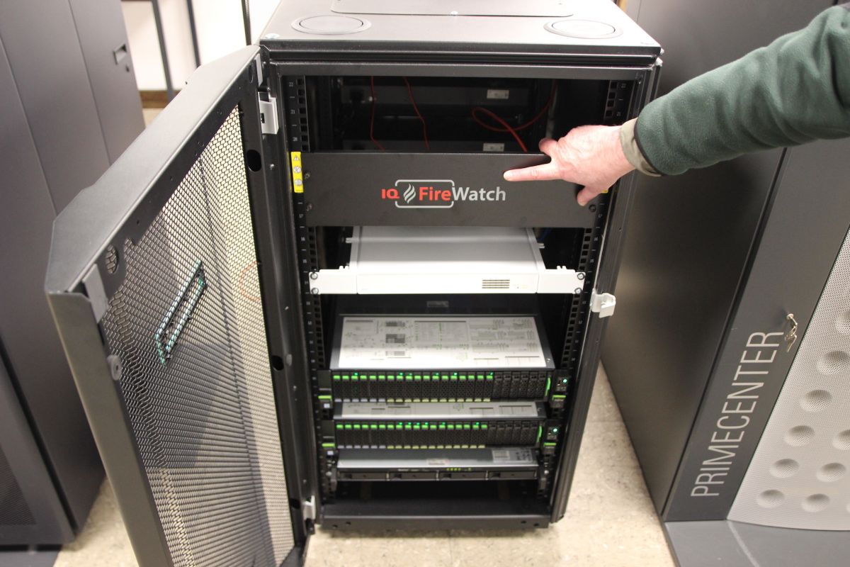 Bilder (Niedersächsische Landesforsten): Die Arbeitsplatzmonitore der Brandwächter. Die Bilder lassen sich auf den Großbildschirm projizieren um unklare Warnmeldungen schneller und besser gemeinsam zu beurteilen. Außerdem: Einblicke hinter die Kulisse des Hightech-Systems, ein neuer Server sorgt für die nötige Rechenleitung des Waldbrand-Überwachungs-Systems.