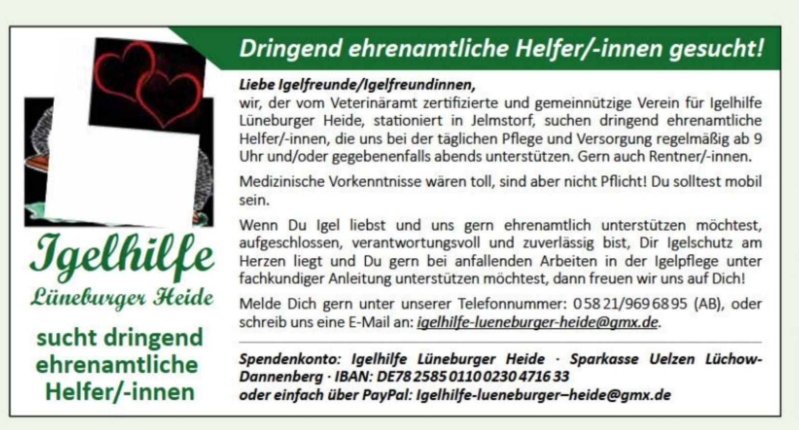 „Liebe(r) Igelfreund innen, wir, die Igelhilfe Lüneburger Heide in Jelmstorf suchen ganz dringend ehrenamtliche Unterstützung, die uns bei unserer täglichen Versorgung und Pflege unserer Igel regelmäßig, vormittags und/oder ggf. abends unterstützen kann. Wir sind ein vom Veterinäramt zertifizierter und gemeinnütziger Verein, der jährlich ca. 350 - 400 Igel,Tendenz steigend, gesund pflegt.