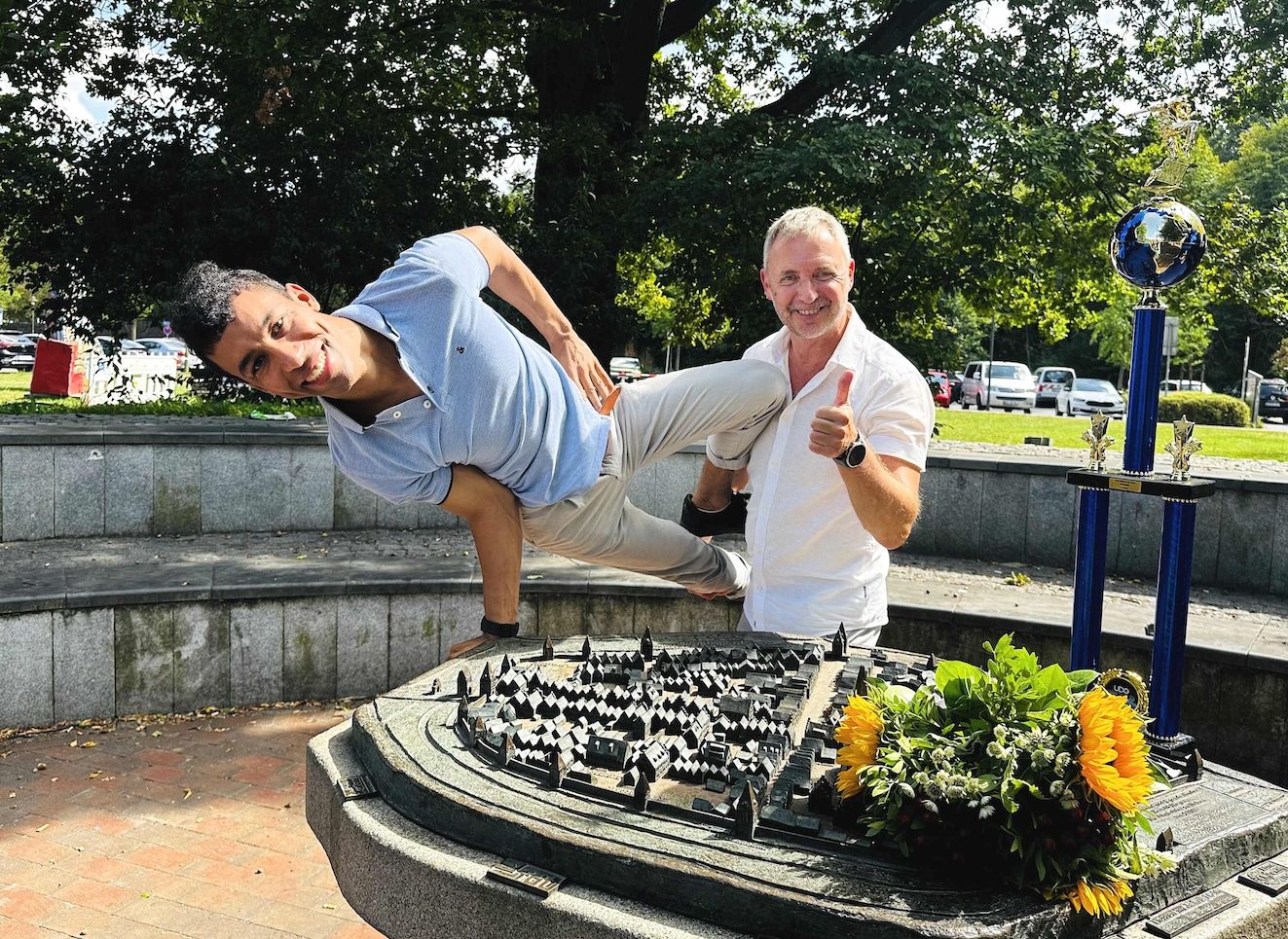 Foto (Hansestadt Uelzen): Bürgermeister Jürgen Markwardt gratuliert dem Weltmeister im Breaking: Dominic „Shoki“ Nass (li.). Der Pokal steht rechts.