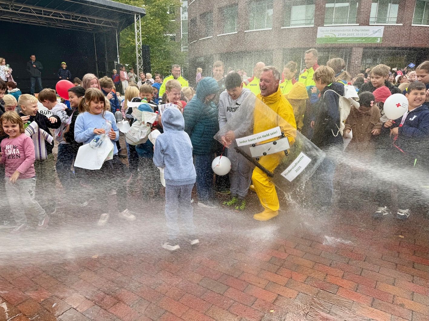 Uelzen. 341 Kinder jubeln laut auf dem Herzogenplatz, dem Uelzener Platz der Kinderrechte: Die Mädchen und Jungen der Hansestadt haben am heutigen Freitag die Wette gegen Bürgermeister Jürgen Markwardt gewonnen. Dieser hatte gewettet, dass keine 333 Kinder kommen, um zu lernen, wie man Leben rettet und zur Heldin oder zum Held des Alltags wird. Seinen Wetteinsatz hat das Stadtoberhaupt sogleich eingelöst und die jungen Siegerinnen und Sieger zu einem Eis eingeladen. Und er musste beweisen, dass er auch ein Held sein kann. In knallgelber Regenkleidung, Gummistiefeln und Regenhut beschützte er die Kinder, damit sie nicht nass werden. Die Jugendfeuerwehr hatte mit einem Schlauch ordentlich Wasser versprüht.