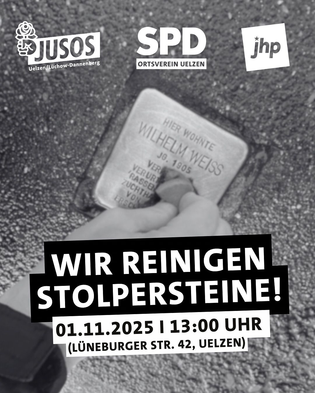 Uelzen. Am 1. November laden der SPD-Ortsverein Uelzen, die Jusos Uelzen/Lüchow-Dannenberg und der Landtagsabgeordnete Jan Henner Putzier zur Stolpersteine-Reinigungsaktion ein. Treffpunkt ist um 13:00 Uhr vor dem Dr.-Peter-Struck-Haus (Lüneburger Str. 42, 29525 Uelzen).