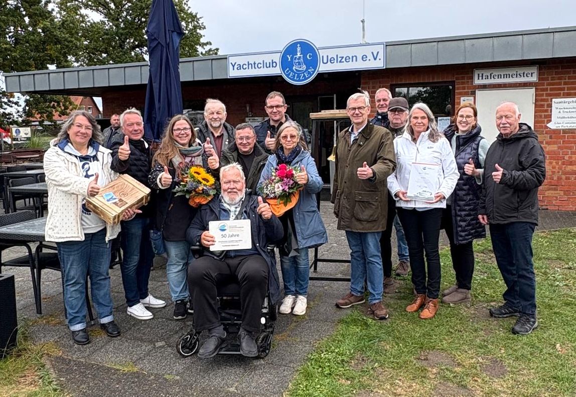 Dirk Hartung, Leiter des Prüfungsausschusses Niedersachsen des Deutschen Motoryachtverbandes, betonte in seiner Ansprache besonders das familiäre und unterstützende Umfeld während der Führerscheinausbildung, das den Prüfungsprozess bei den Uelzenern sowohl für die Prüflinge als auch für ihn und die anderen Prüfer so einzigartig macht. Zur Feier des Jubiläums überreichte er eine Plakette, die den Yachtclub für die fünf Jahrzehnte als anerkannte Ausbildungsstätte auszeichnet, sowie eine neue Verbandsflagge und weitere Präsente.