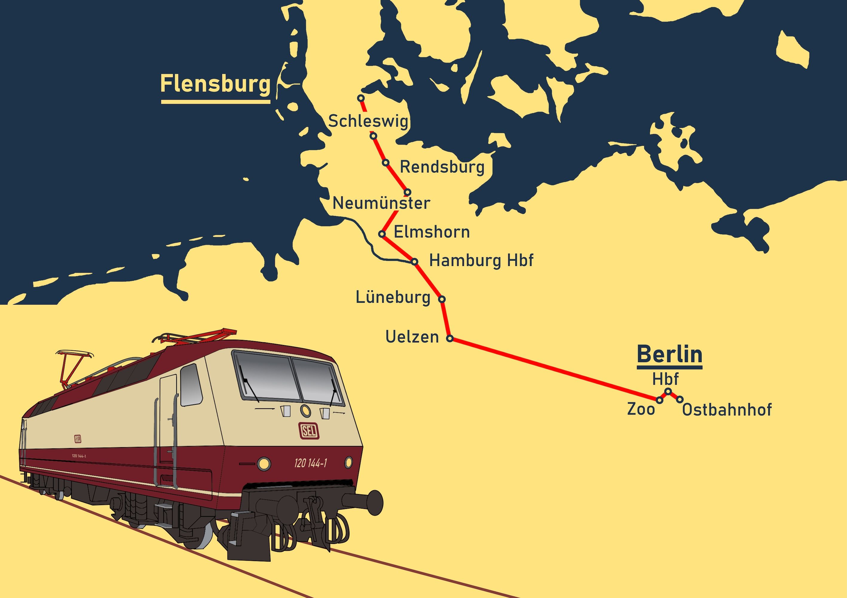 „Am Nikolaustag starten wir gegen 7 Uhr in Flensburg zu unserer Sonderzugfahrt in Richtung Bundeshauptstadt. Nach den Zustiegshalten in Schleswig und Rendsburg befahren wir mit unserem Zug die Rendsburger Hochbrücke mit einem herrlichen Ausblick über die Stadt und den Nord-Ostsee-Kanal. Kurz darauf wird der Bahnhof Neumünster erreicht, wo Sie ebenfalls zusteigen können, bevor es in den Hamburger Ballungsraum geht. Nach einem kurzen Zwischenstopp in Elmshorn geht es in die Freie und Hansestadt Hamburg, wo wir für Euch am Hauptbahnhof und in Harburg halten. Im Anschluss befahren wir einem der am stärksten genutzten Schienenwege Deutschlands auf unserem Weg durch die Winterlandschaft zu den letzten beiden Zustiegshalten in den Hansestädten Lüneburg und am Hundertwasserbahnhof in Uelzen. Danach geht es im Schnellzugtempo weiter Richtung ehemaliger innerdeutscher Grenze. Gegen Mittag erreichen wir unser Ziel: Berlin! Aussteigen können Sie am Zoologischen Garten, am Hauptbahnhof und am Ostbahnhof.