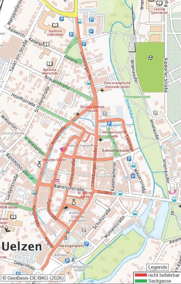 Von 7 bis 17 Uhr sind daher zahlreiche Straßen in der Innenstadt für den Fahrzeugverkehr gesperrt. Betroffen ist ein größerer Bereich rund um die Ringstraße, Lüneburger Straße und Veerßer Straße. Die Sperrung der Lüneburger Straße beginnt ab der Einmündung Ebstorfer Straße. Die Veerßer Straße ist bis zur Einmündung in den Kreisverkehr am Busbahnhof am Rathaus gesperrt. Ebenso ist die Ringstraße nicht befahrbar. Auch die innenliegenden Straßen innerhalb dieses Bereichs sowie ein Teilabschnitt der Gudesstraße bis zur Einmündung Rademacherstraße und Am Taterhof sind gesperrt. Eine Übersicht der betroffenen Straßen ist der beigefügten Karte zu entnehmen.