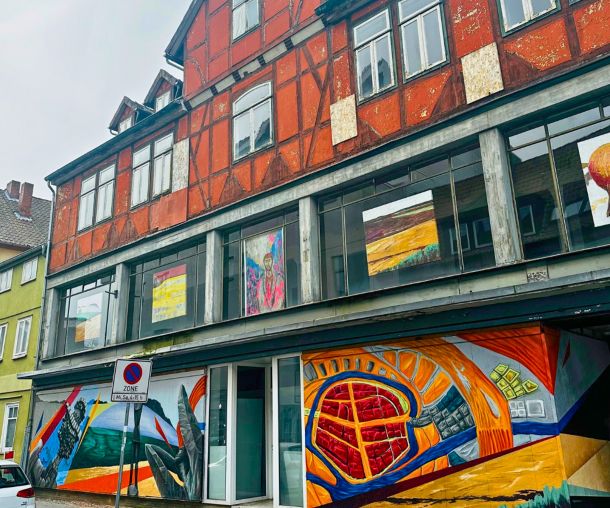 Im Obergeschoss des leerstehenden Gebäudes werden dauerhaft Werke von Georg Münchbach ausgestellt, am besten zu sehen von der anderen Straßenseite. Der in Freiburg geborene Künstler war viele Jahre in Uelzen tätig und prägt mit seinen Werken den öffentlichen Raum.