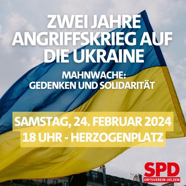 Uelzen. Der SPD-Ortsverein Uelzen teilt mit: "Am 24.02.2022 hat mit einem brutalen und völkerrechtswidrigen Angriff von Russland auf die Ukraine der Ukraine-Krieg begonnen - am 24.02.2024 jährt sich der Kriegsbeginn bereits zum zweiten Mal. Ein Krieg vor den Toren Europas, eine Mahnung, dass das Friedensprojekt Europa keine Selbstverständlichkeit ist, sondern verteidigt werden muss. Die Folgen des Krieges spüren wir bis heute: Die Gasimporte wurden gestoppt mit großem Einfluss auf unsere Energieversorgung, weitreichende Sanktionen verhängt, die Wiedereinführung der Wehrpflicht wird diskutiert…